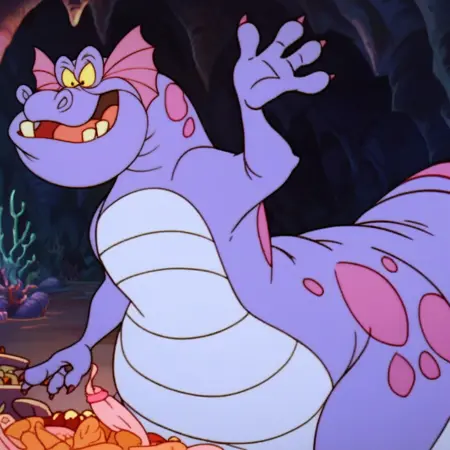 simon, male, sea dragon, yellow sclera, purple skin, pink body spots, pink headfins, colored underbelly, long tail, twin tailfin, striped tail, sharp nails, fat