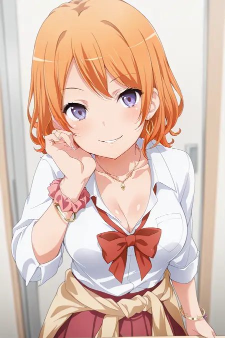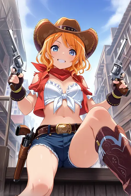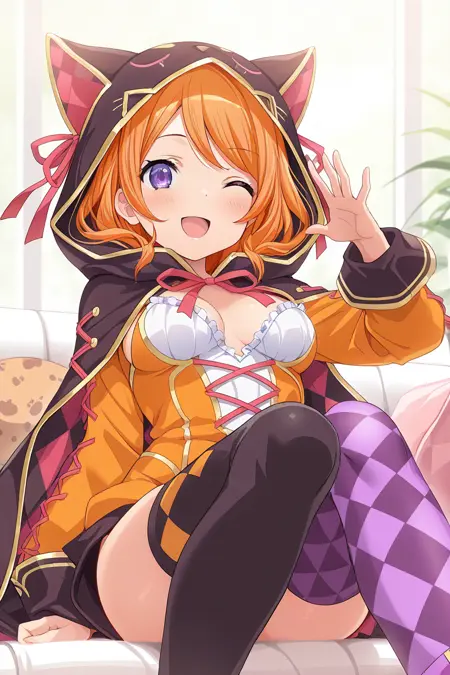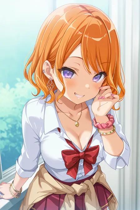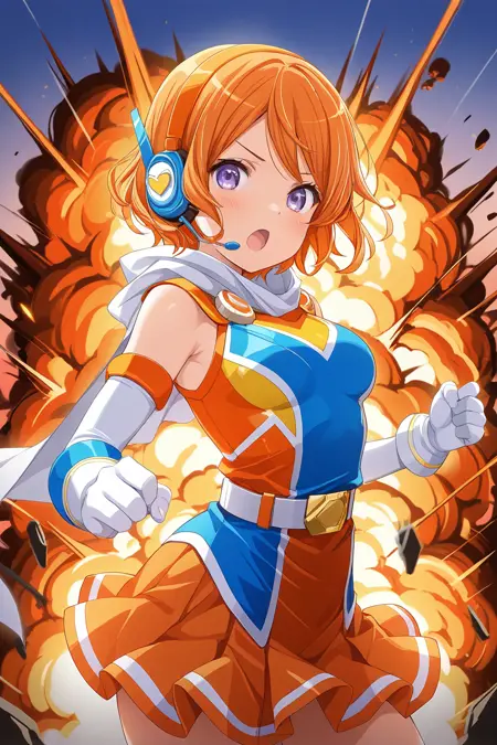 tsukasa, 1girl, solo, gloves, smile, skirt, fingerless gloves, thighhighs, brown gloves, orange hair, belt, jacket, earrings, jewelry, stage outfit
