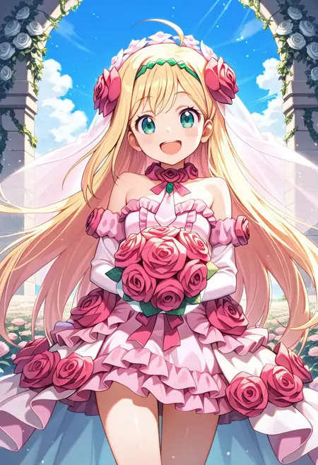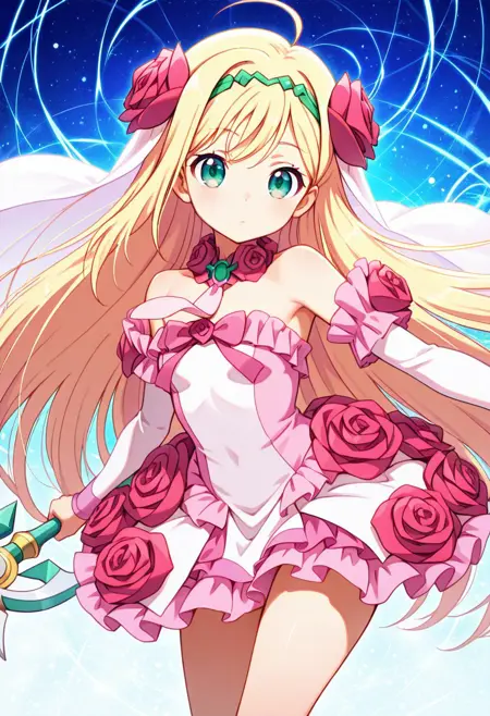 To generate Her 1st tranceunion art - 1girl, liones yelistratova (\hina logi: from luck & logic\), blonde hair, very long hair, green eyes, ahoge, pink tranceunion, pink dress, short dress, bare shoulder, strapless sleeves, flower headress, roses neckwear, light pink necktie, pink bowtie, long veil, floral dress, hair ornament
