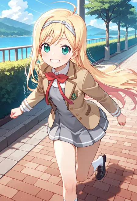 - 彼女の学校制服のアートを生成する場合:1girl, liones yelistratova (\hina logi: from luck & logic\), ブロンドヘア、非常に長い髪、緑の目、あほ毛、学校制服、ブレザー、ローファー、白シャツ、赤いリボン、グレーのスカート、プリーツスカート、白い靴下、白いヘアバンド、