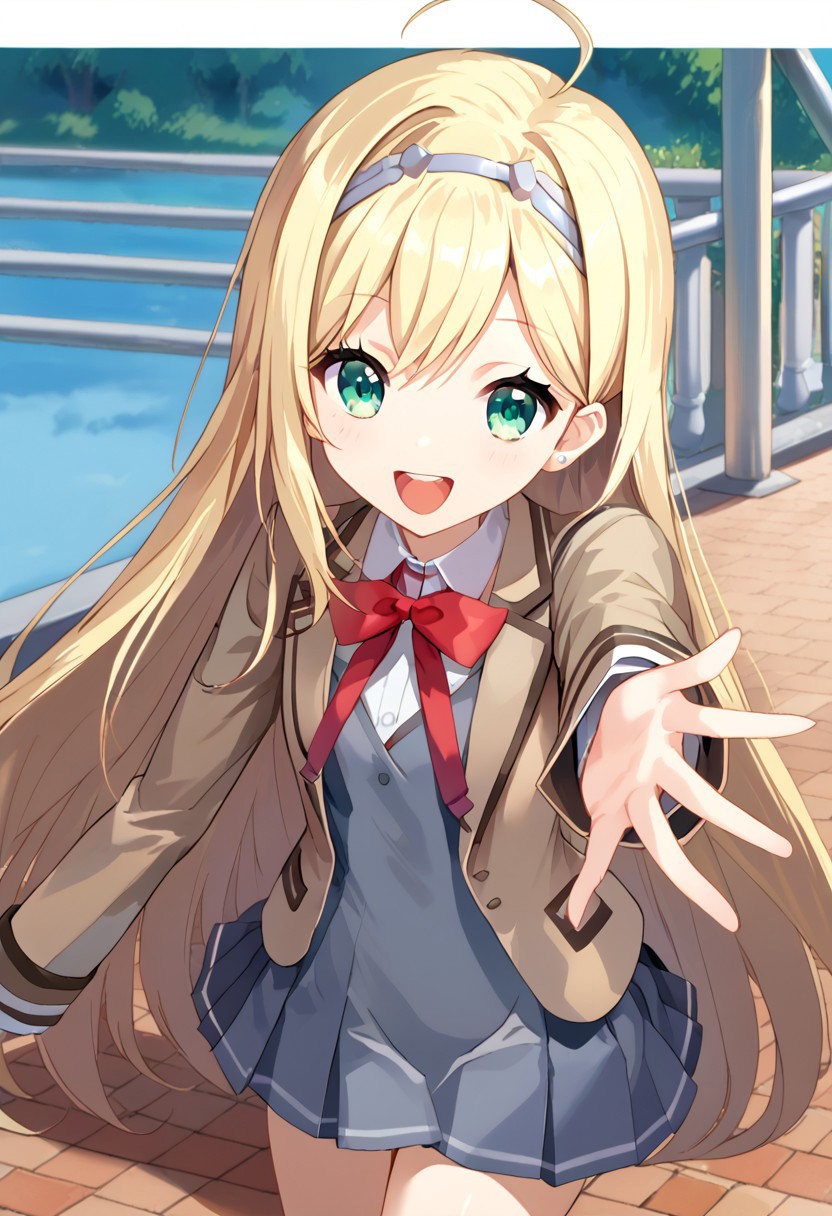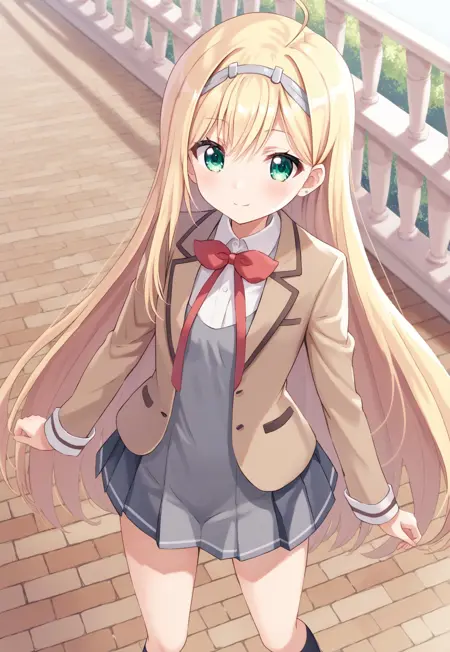 • To generate Her School uniform outfit art - 1girl, liones yelistratova (\hina logi: from luck & logic\), blonde hair, very long hair, green eyes, ahoge, school uniform, blazer, loafer, white shirt, red bowtie, gray dress, pleated skirt, white sock, white hairband,