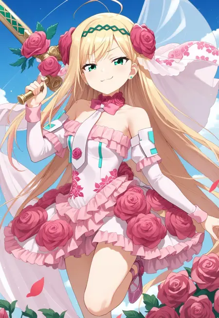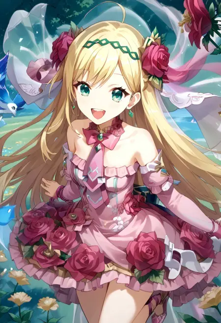 • To generate Her 1st tranceunion art - 1girl, liones yelistratova (\hina logi: from luck & logic\), blonde hair, very long hair, green eyes, ahoge, pink tranceunion, pink dress, short dress, bare shoulder, strapless sleeves, flower headress, roses neckwear, light pink necktie, pink bowtie, long veil, floral dress, hair ornament