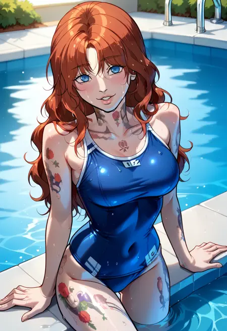 killerpetermatthew, long hair, brown hair, twin braids, black hair ribbon, blue eyes, tattoo, full tattoo, neck tattoo, blue sweater, off shoulder, pleated skirt, leg tattoo