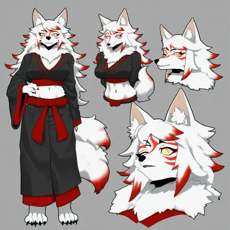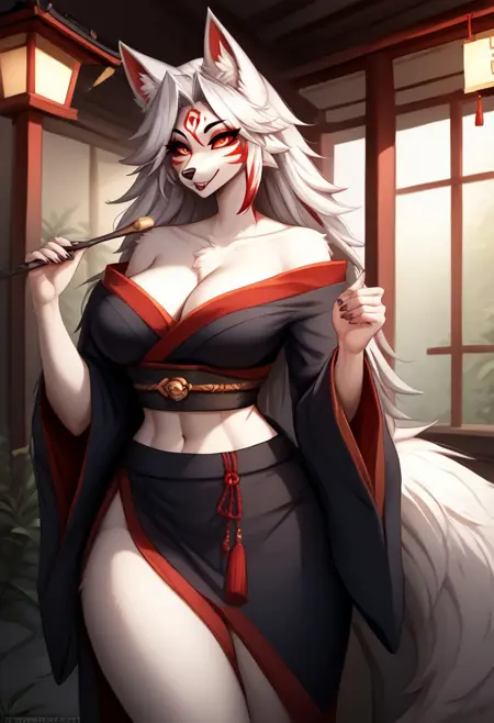 1girl,Amaterasu,女性兽人,拟人化,狼娘,蓬松毛发,白色皮毛,身体皮毛,狼耳,狼尾,黑色尾尖,白发,黄眼,沙漏型身材,耳内绒毛,腹部,尾端绒毛,毛丛,面部纹路,红色纹饰,爪子,红色高光,大胸,和服,褌