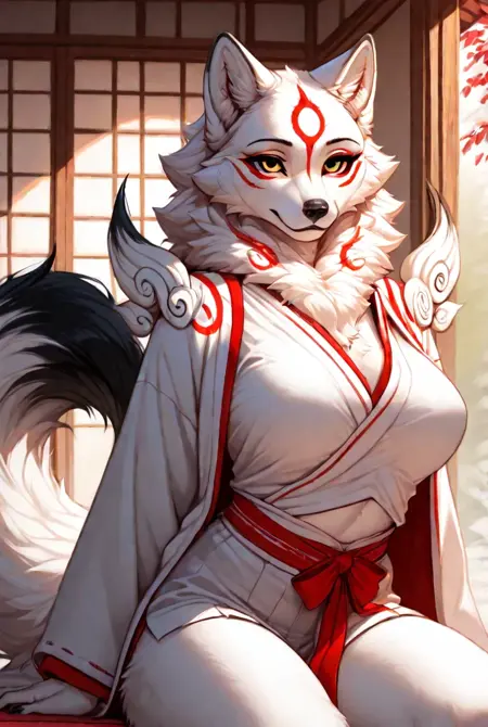 1girl,Amaterasu,female furry,anthro,wolf girl,fluffy hair,white fur,body fur,wolf ears,wolf tail,black tipped tail,white hair,yellow eyes,hourglass figure,inner ear fluff,midriff,tail tuft,fur tuft,facial mark,red markings,claws,red highlights,large breast,japanese clothes,fundoshi