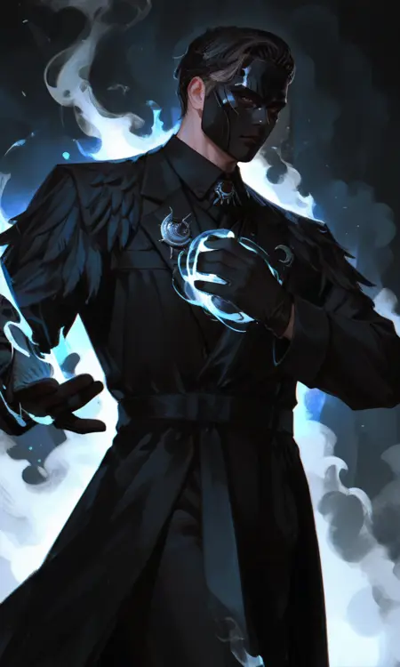 | 학습된 단어 | male, boy, silver_white_streak, black_hair, side_swept_hair, medium hair, sleek_hair, defined_jawline, pale_skin, high_cheekbones, facial tattoo, black_mask, ornate_mask, black_suit, feathered_collar, black gloves, black_coat, silver_brooch, vrn복사됨! |