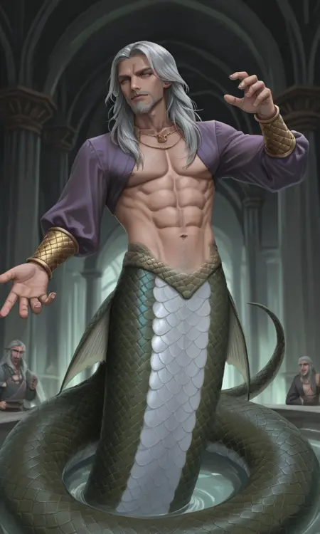 male, silver-white long hair, straight, silver beard, goatee silver-gray coloration, mature face, strong jawline, purple open-front tunic, billowy sleeves, green snake tail, merman tail, gold bracers, gold necklace, merlin