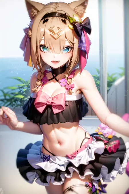 pardofelis (midsummer collector) (honkai impact), pardofelis (honkai impact), 이색시력, 프릴 비키니, 수영복, 핑크 리본, 공식 대체 코스튬, 고양이 소녀, 밝은 동공, 파란 눈, 초록 눈, 밝은 갈색 머리카락, 눈밑 흑점