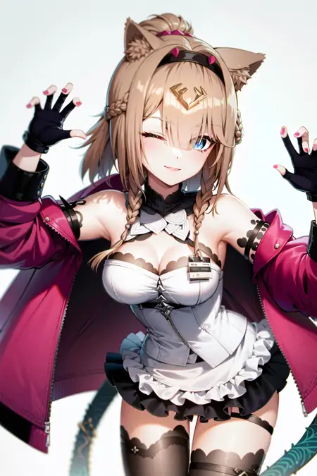 pardofelis (spectral claws) (honkai impact), pardofelis (honkai impact), 헤어포니테일, 공식 대체 코스튬, 공식 대체 헤어스타일, 고양이 소녀, 밝은 동공, 파란 눈, 이색시력, 초록 눈, 머리 장식, 핑크 자켓, 자켓, 투톤 헤어, 분홍 머리카락, 다채로운 머리카락, 블랙 헤어밴드, 단일 테이크업
