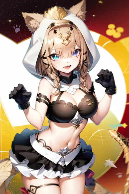 pardofelis (reverist calico) (honkai impact), pardofelis (honkai impact), 이색시력, 공식 코스튬, 고양이 소녀, 파란 눈, 초록 눈, 밝은 갈색 머리카락, 눈밑 흑점, 블랙 비키니, 블랙 스커트, 프릴 스커트, 비키니 상의만