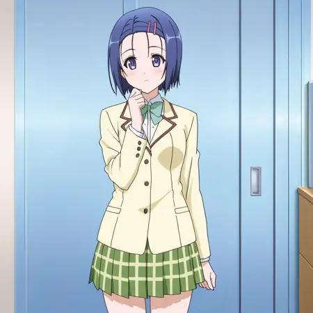 触发词:Haruna, 1girl, 短发, 校服, 紫色眼睛, 发饰, 发夹, 绿色蝴蝶结, 蓝色头发, 格子裙, 毛衣背心, 绿色领结, 百褶裙, 短袖, 衬衫, 牛仔镜头