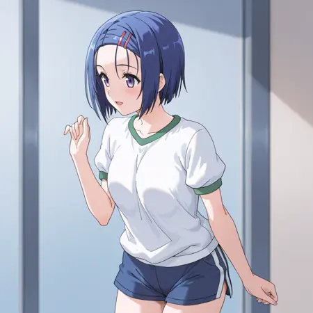 带运动装的触发词:HarunaSport, 健身短裤, 短发, 蓝色头发, 发饰, 健身服, 1girl, 发夹, 紫色眼睛, 衬衫, 牛仔镜头