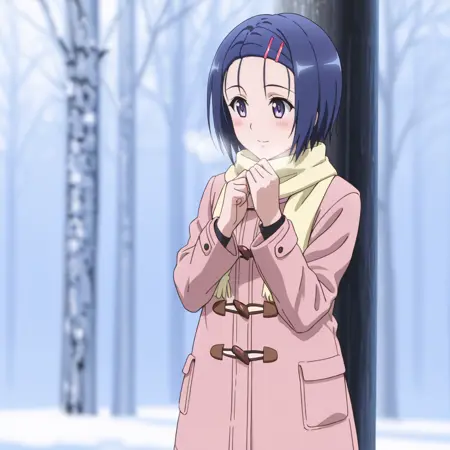 带冬衣的触发词:HarunaWinterCoat, 1girl, 短发, 蓝色头发, 围巾, 发饰, 外套, 紫色眼睛, 发夹, 牛仔镜头