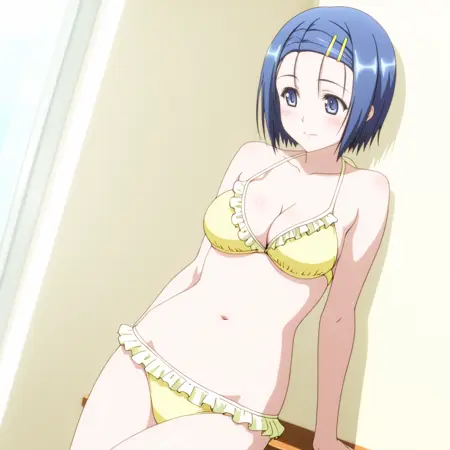 带黄色比基尼的触发词:HarunaBra, 1girl, 单人, 泳装, 黄色比基尼, 短发, 蓝色头发, 蓝色眼睛, 荷叶边, 发饰, 肚脐, 荷叶边比基尼, 中等大小胸部, 发夹, 深沟, 牛仔镜头