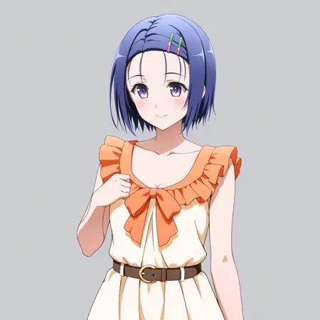 带橙色连衣裙的触发词:HarunaOrangeDress, 1girl, 短发, 紫色眼睛, 蓝色头发, 发饰, 连衣裙, 发夹, 腰带, 牛仔镜头