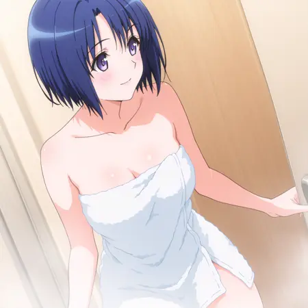 带毛巾的触发词:HarunaCover, 1girl, 裸体裹毛巾, 短发, 蓝色头发, 锁骨, 紫色眼睛, 裸露肩膀, 牛仔镜头