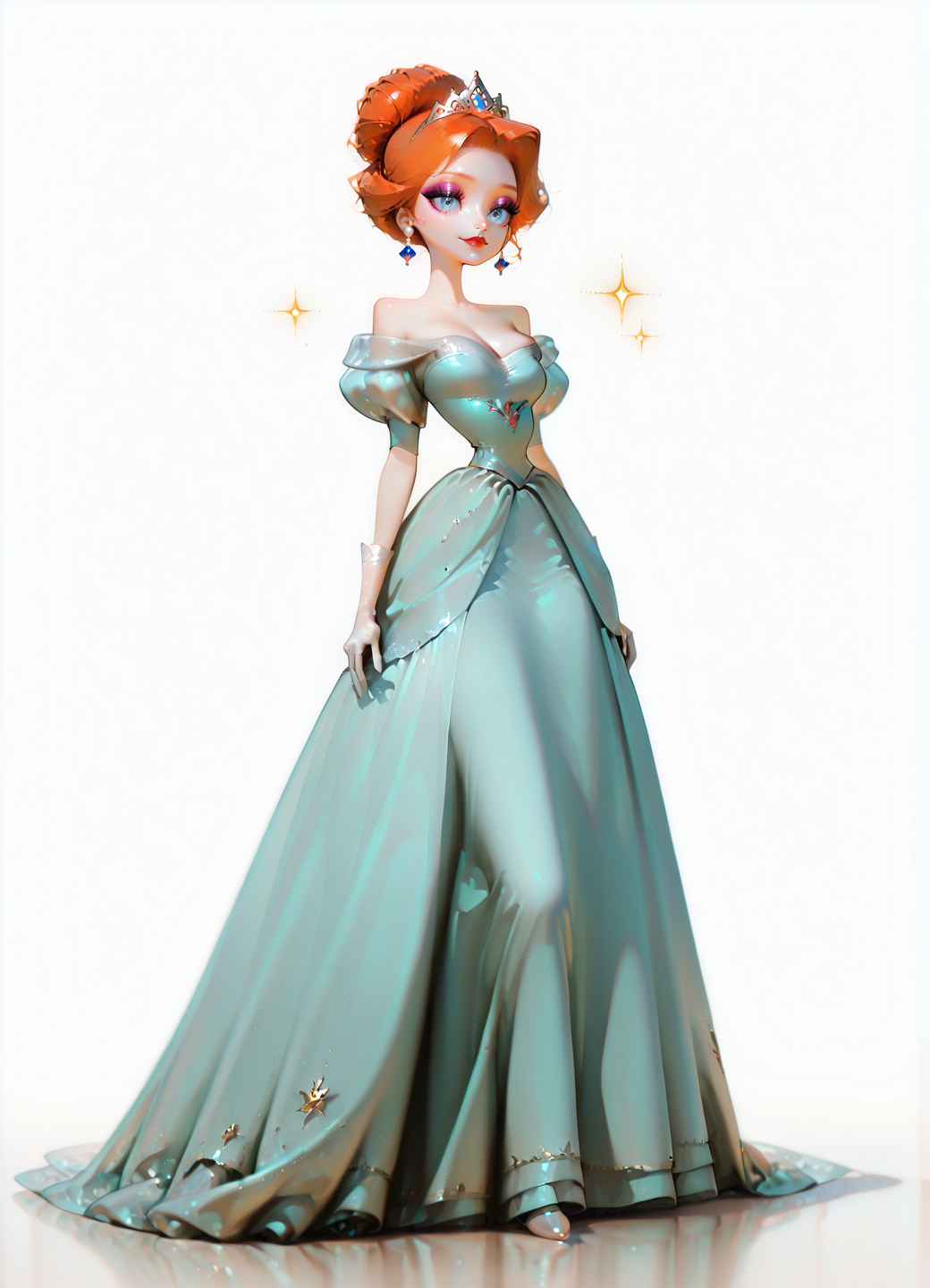 Prompt: 1girl, solo, breasts, looking at viewer, blush, smile, short hair, blue eyes, large breasts, blonde hair, dress, cleavage, jewelry, bare shoulders, off-shoulder dress, blue hairband, hair up, blue gemstone, updo, princess,