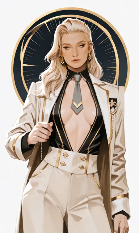 | 训练词汇 | 40 y.o. woman, almond shape eyes, light blonde hair, slicked back hair, long hair, grey eyes, defined cheekbones, defined jawline, pale skin, double-breasted jacket, gray tie with gold accent, gold chain accessory on pocket, plunging neckline, vesper已复制! |