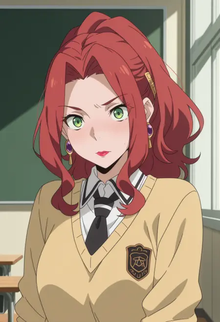 1girl, solo, m4lty, red hair, ponytail, green eyes, jewelry, earrings, lipstick, {attire tags}, {actions and/or poses}, {indoors || outdoors}, {background description}