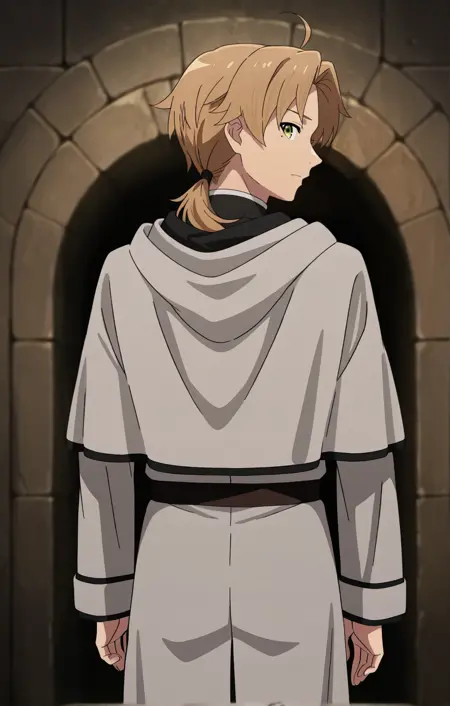 rudeus, rudeus greyrat, light brown hair, green eyes, parted bangs. mole under eye, low ponytail, single ponytail, ahoge,