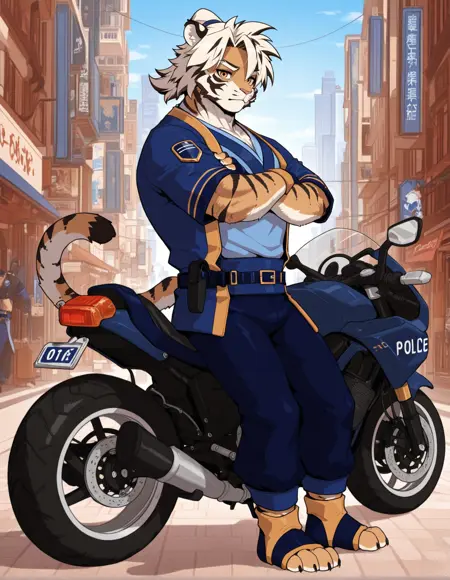 police uniform, fingerless gloves,blue furgonomic footwearif feet are visibleOptional: