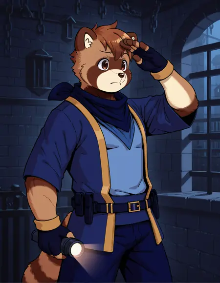 police uniform, fingerless gloves, blue neckerchief, 발이 보이면blue furgonomic footwear
