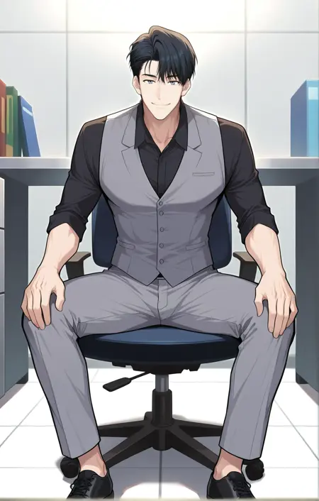 black shirt, collared shirt, grey vest, grey pants, waistcoat, black shoes,