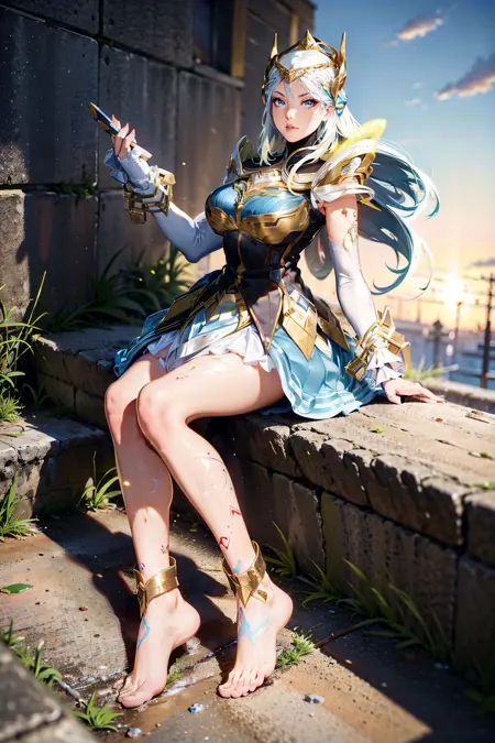 プロンプト: Butterfly_The_Sagacious, 1girl, solo, long hair, white hair, multicolored hair, gradient hair, crown, looking at viewer, blue eyes, eyeshadow, brush, nose, lips, pink lips, shoulder armor, breastplate, breasts, large breasts, dress, armored dress, armor, elbow gloves,, gloves, legs, leg tattoo, barefoot