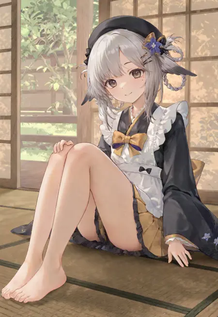 fengyunhefu,beret,hair flower,hairclip ,frilled apron, white apron, wa maid, black kimono, black frilled dress, yellow pleated skirt, back bow,wide sleeves, bare legs, barefoot