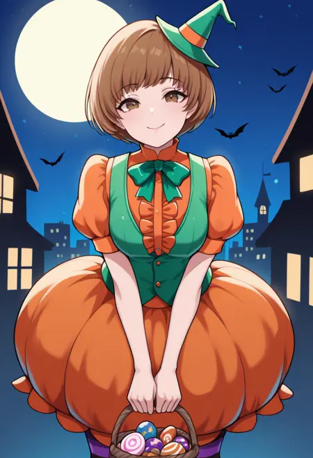 万圣节: ch1ehalloween, 短发, 棕发, 绿色头饰, 迷你女巫帽, 棕眼, 绿色背心, 橙色衬衫, 中央荷叶边, 绿色蝴蝶结, 蓬松短袖, 橙色裙子, 气泡裙, 紫色连裤袜, 条纹连裤袜