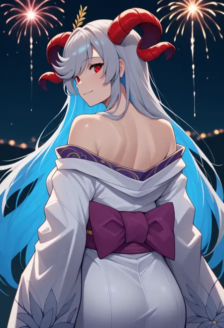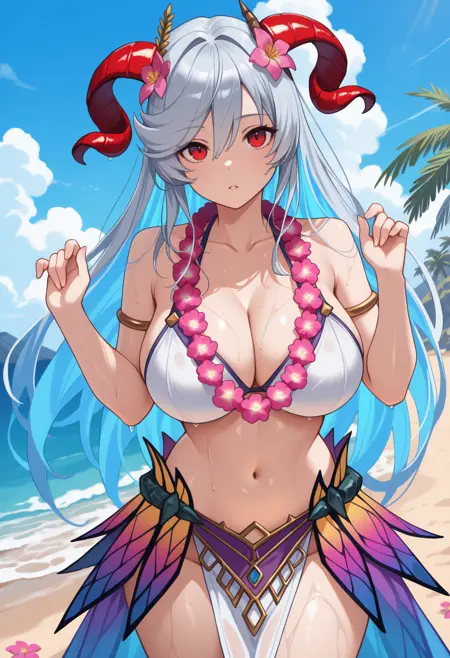 순간의 여름: fr3yjasummer, 긴 머리, 이색 머리, 회색 머리, 파란 머리, 눈 사이 머리, 머리 꽃, 분홍 꽃, 빨간 뿔, 염소 뿔, 곡선 뿔, 빨간 눈, 흰 비키니, 팔찌, 그라데이션 스커트, 노란 스커트, 보라 스커트, 파란 스커트, 쇼걸 스커트, 골반 커튼, 꽃 목걸이, 어깨 노출, 빗장뼈, 배, 배꼽, 가슴 라인, 큰 가슴