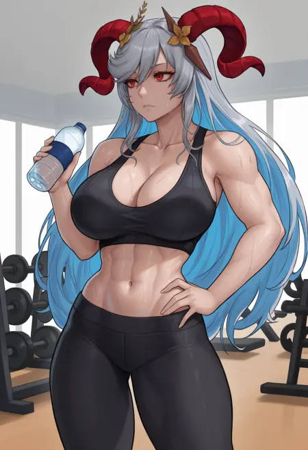 기본 복장: fr3yjadef, 긴 머리, 이색 머리, 회색 머리, 파란 머리, 머리 장식, 빨간 뿔, 염소 뿔, 곡선 뿔, 빨간 눈, 가시, 바디스톡킹, 투명한 가슴 라인, 긴 드레스, 흰 드레스, 층층이 디자인된 드레스, 큰 가슴