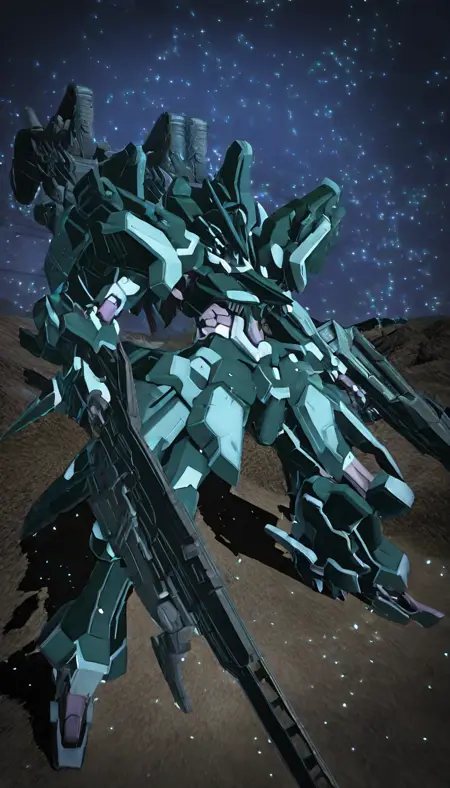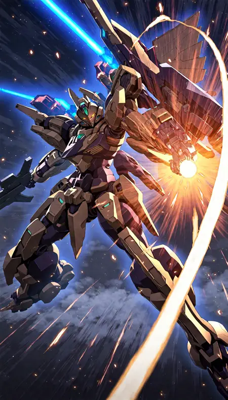 공중전에 특화된 경량 디자인의 로봇을 생성할 수 있습니다. 프롬프트에 (mecha flying in the sky:2)를 입력하면 공중전 장면을 생성할 수 있습니다.