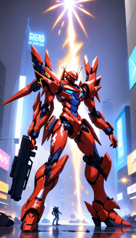 (LRS:1.5), (mecha flying in the sky:2), (flying:2),best quality, masterpiece, ultra-detailed, mecha robot, (ultra-detailed mecha armor), full armor, (very large size mecha:1.5), glowing eyes, (full body:1.2), (mechanical parts:1), (robot joints:1), (military parts:1.1), (heroic parts:1.1), cable, (dynamic pose:2),(Detailed eye description:1.2),(huge mechanical weapon:1.2), (detailed weapon description:1.2), (holding weapon and weapon :1.5)<lora:srdxl_v2g:0.8>