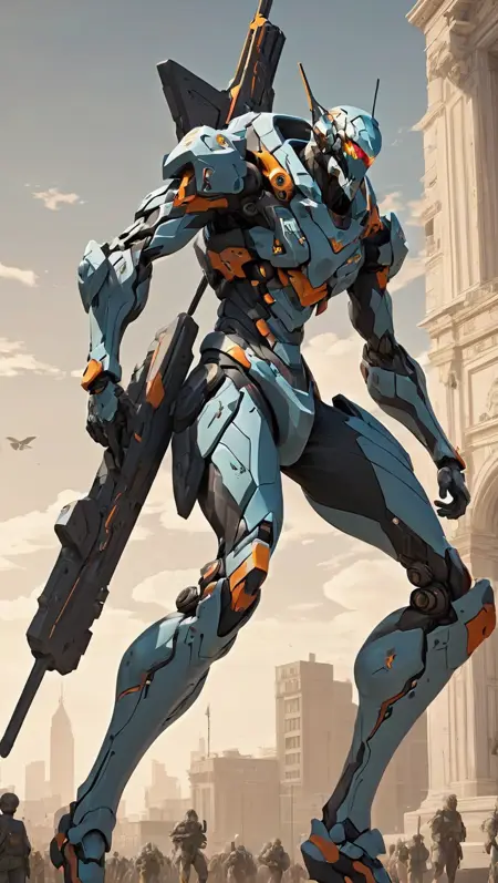 (HRS:0.7),(masterpiece), best quality, ultra-detailed,(mecha robot:1),(ultra-detailed mecha armor), glowing eyes, (full body:1.2), (mechanical parts:1), (robot joints:1), (military parts:1), (chest parts:1.5), (heroic parts:1.5),(huge mechanical weapon:1.2), (detailed weapon description:1.2), (holding weapon:1.5) <lora:srdxl_v2g:0.8>
