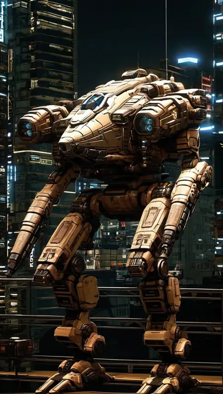 可生成具有沉重感和厚重体型的机器人。若加入武器相关提示,可增强视觉冲击力。