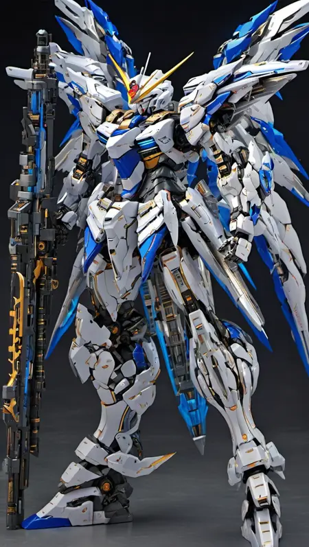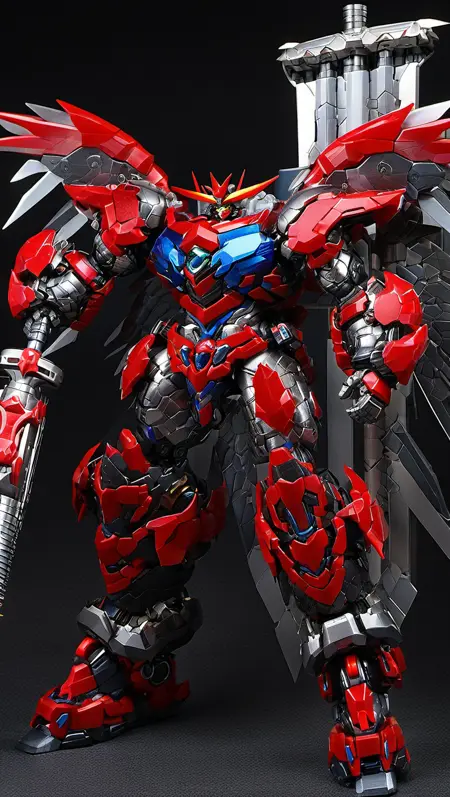 (RRS:1),(MECHA-WINGS:2),best quality, masterpiece, ultra-detailed, mecha robot,(dynamic pose:2),(ultra-detailed mecha armor), full armor, (very large size mecha:1.5), glowing eyes, (full body:1.2), (mechanical parts:1), (robot joints:1), (military parts:1), (heroic parts:1),(Detailed eye description:1.2),(huge mechanical weapon:1.2), (detailed weapon description:1.2), (holding weapon and weapon :1.5) <lora:srdxl_v2g:0.8>