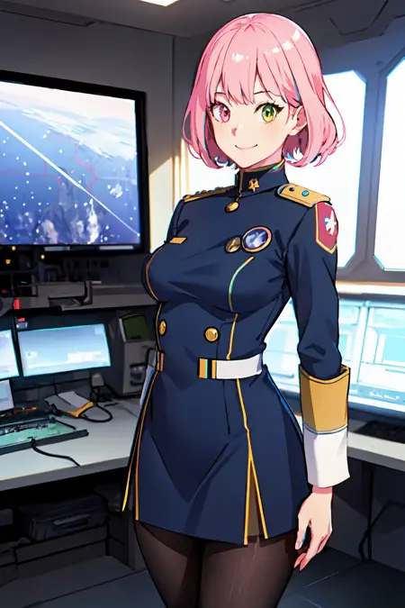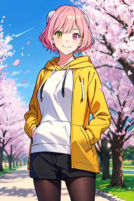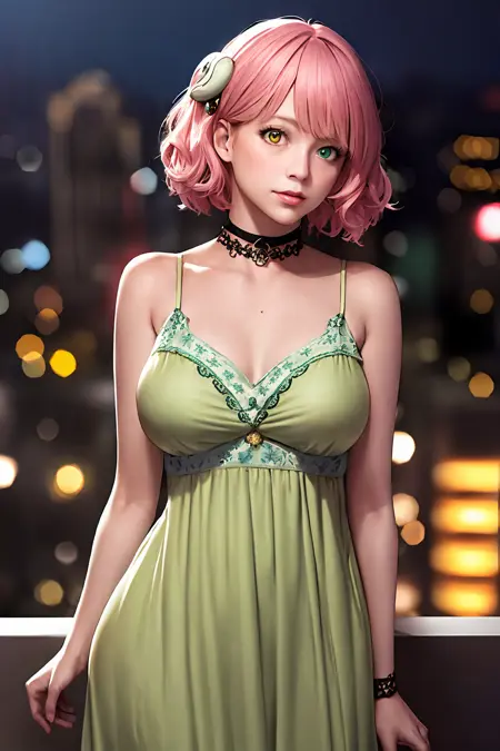 キャラクター: aries_spring, ピンクの髪, 短髪, 髪飾り, 異色瞳, 緑の目, 黄色の目