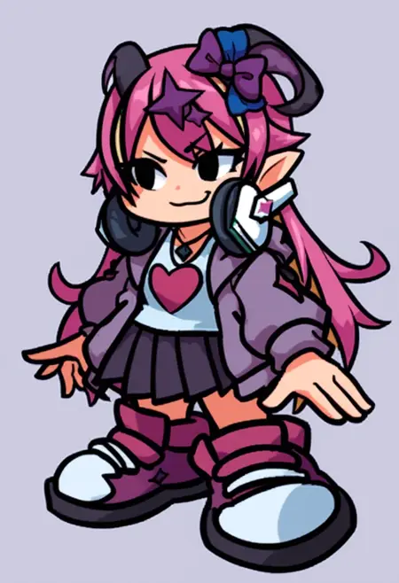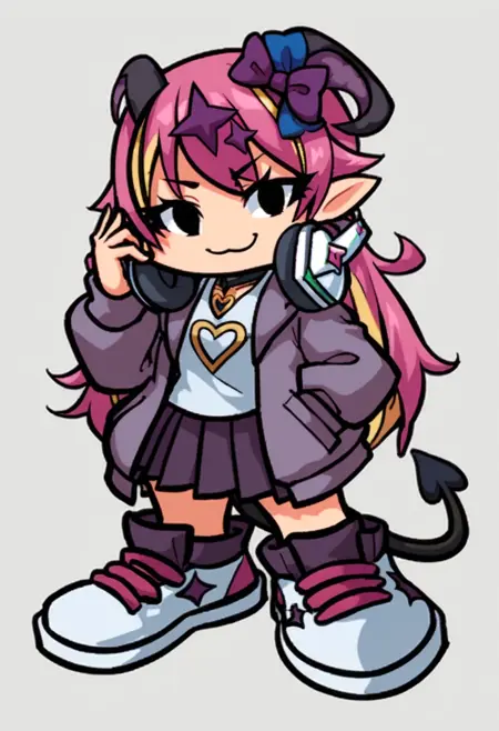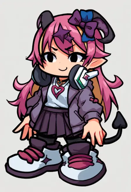 ManoAloeFNF, 1girl, long pink hair with a blonde inner side, black eyes, fair skin, two horns, white top, purple colored jacket draped over, purple colored skirt, pink shoes, long black demon tail, heart-backslash necklace around neck, black and white headphones with multi-colored highlights around neck, 2 star shaped hair clips in hair, 2 bows around horn, short, chibi, digital art, cartoon, energetic and stylish appearance,