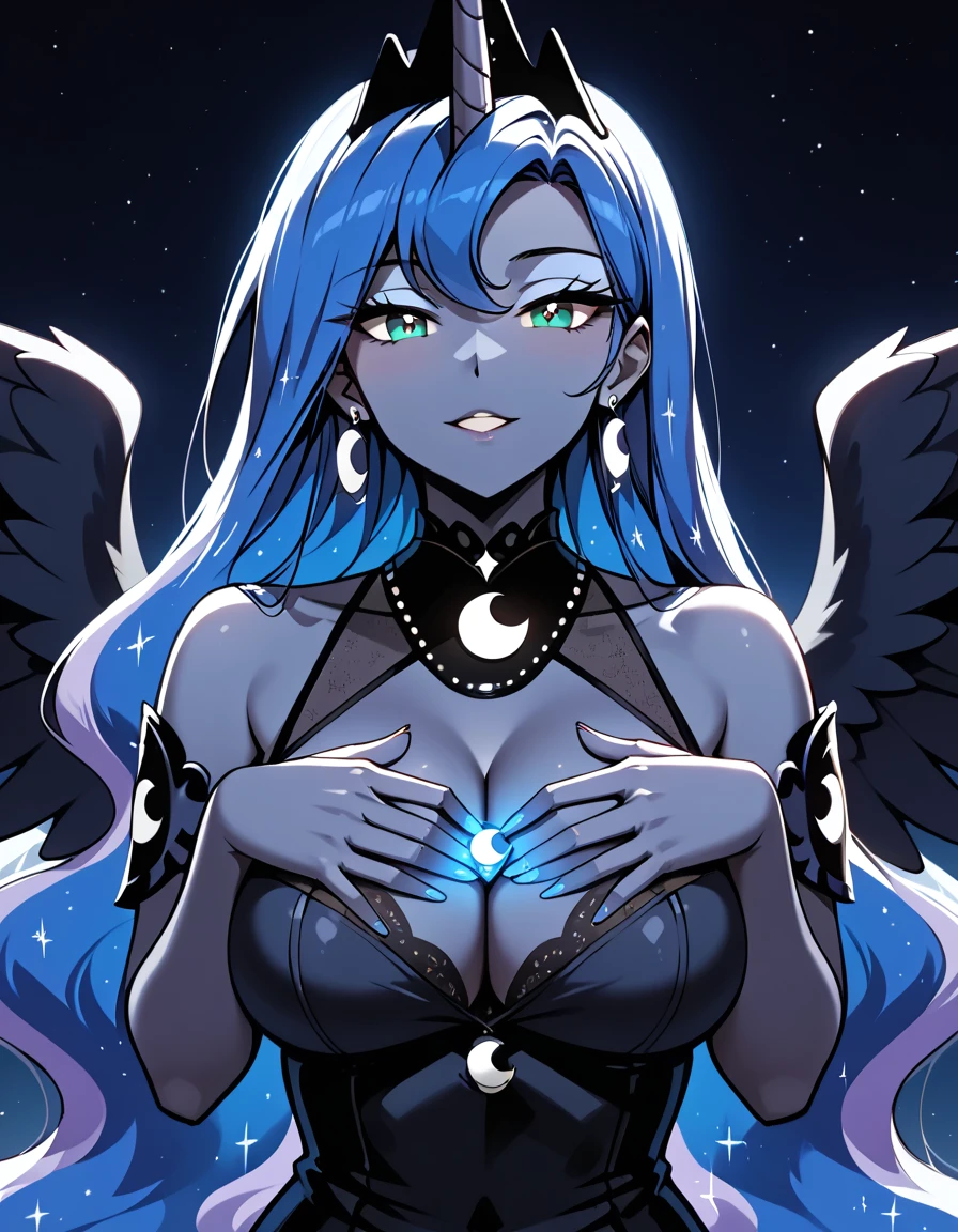 추가 부분을 제거하려면 다음 단어를 부정 프롬프트에 포함하세요: “검은 초승달 왕관, 왕관, 날개, 뿔, 파란 피부, 색깔 있는 피부,”