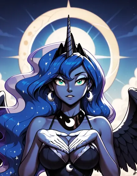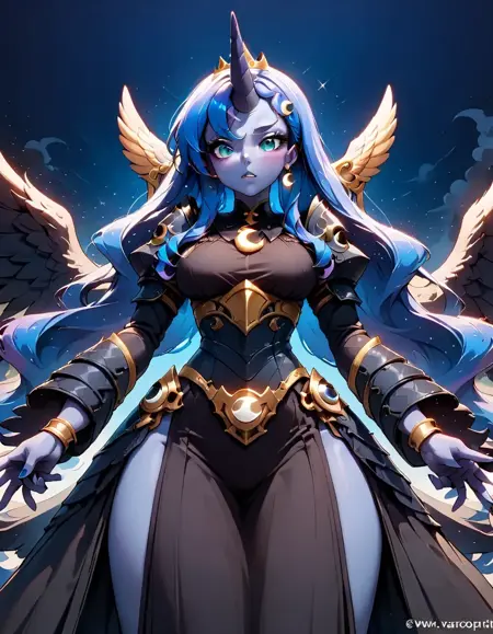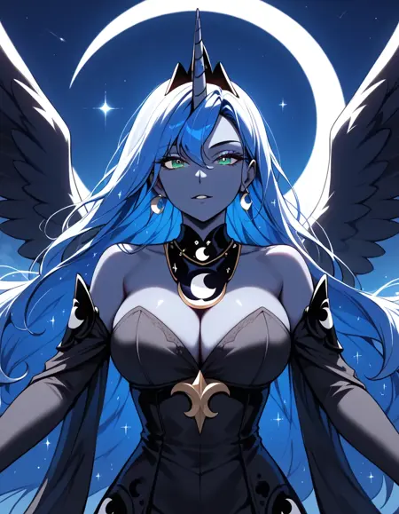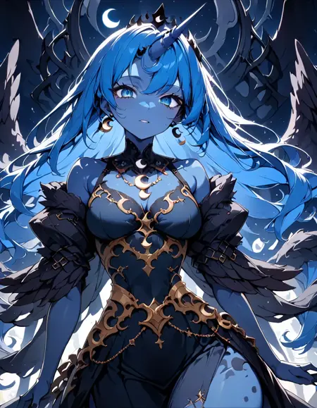 If you want to remove the extra parts of put these words in Negative Prompts: “black crescent crown, crown, wings, horn, blue skin, colored skin,”