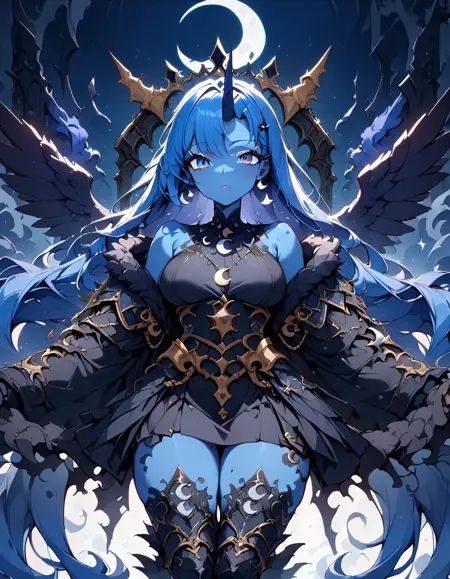 추가 부분을 제거하려면 다음 단어를 부정 프롬프트에 포함하세요: “검은 초승달 왕관, 왕관, 날개, 뿔, 파란 피부, 색깔 있는 피부,”