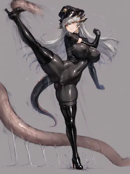 inverseikick,1girl,nun,breasts,latex,bodysuit,kicking,covered nipples,tentacles,large breasts,cameltoe,thighhighs,solo,boots,long hair,cum,skin tight,high heels,open mouth,thigh boots,ass,gloves,motion blur,elbow gloves,high heel boots,slime (substance),monster,impossible bodysuit,legs,