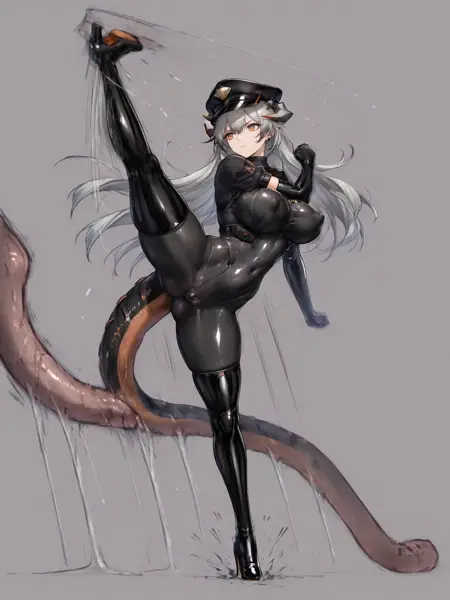 ikicking,1girl,kicking,thigh boots,breasts,thighhighs,bodysuit,elbow gloves,covered nipples,boots,long hair,large breasts,solo,gloves,skin tight,cameltoe,latex,shiny clothes,standing on one leg,covered navel,thighs,high heels,high heel boots,one leg up,monster,tentacles