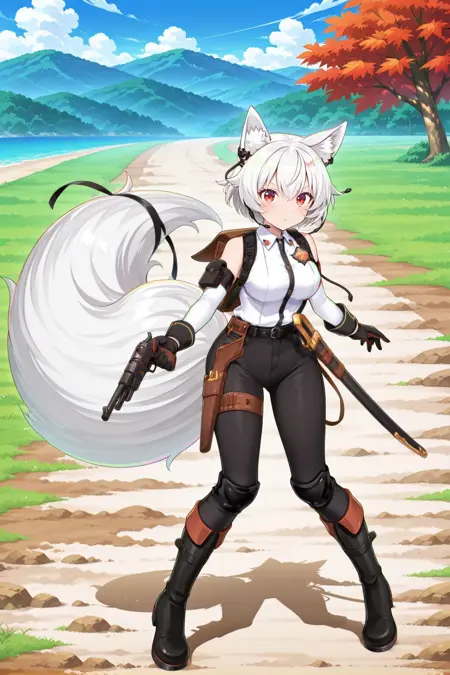 inubashiri momiji, 1girl, solo, red eyes, white hair, short hair, wolf ears, wolf tail, large tail,, inubashiri momiji \(serious sheriff\), alternate costume, black earphones, white shirt, collared shirt, sleeveless shirt, badge, detached sleeves, arm pouch, black gloves, black belt, black pants, black boots, knee boots, thigh holster, tail ribbon, tail ornament, brown backpack, holding gun, handgun, sword, sheath,