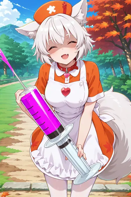 inubashiri momiji, 1girl, solo, red eyes, white hair, short hair, wolf girl, wolf ears, wolf tail, inubashiri momiji \(death watch nurse\), alternate costume, alternate headwear, nurse cap, orange hat, print hat, paw print, red collar, animal collar, heart pendant, orange dress, short sleeves, white apron, white pantyhose, nurse, holding machinery,