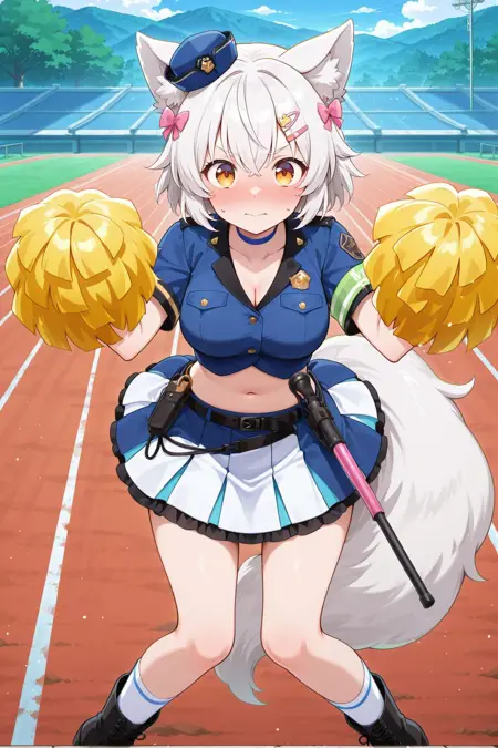 inubashiri momiji, 1girl, solo, yellow eyes, white hair, medium hair, wolf girl, wolf ears, wolf tail, medium breasts,, inubashiri momiji \(officer supporting the people\), alternate costume, alternate headwear, blue hat, mini hat, hair bow, pink bow, dog hair ornament, pink hairclip, blue choker, police uniform, blue shirt, crop top, short sleeves, cleavage, navel, two-tone skirt, blue skirt, white skirt, frilled skirt, white socks, black boots, lace-up boots, baton \(weapon\), pom pom \(cheerleading\),