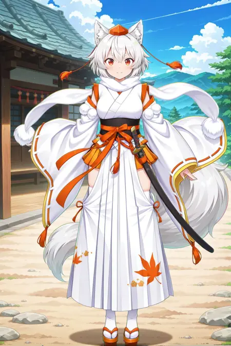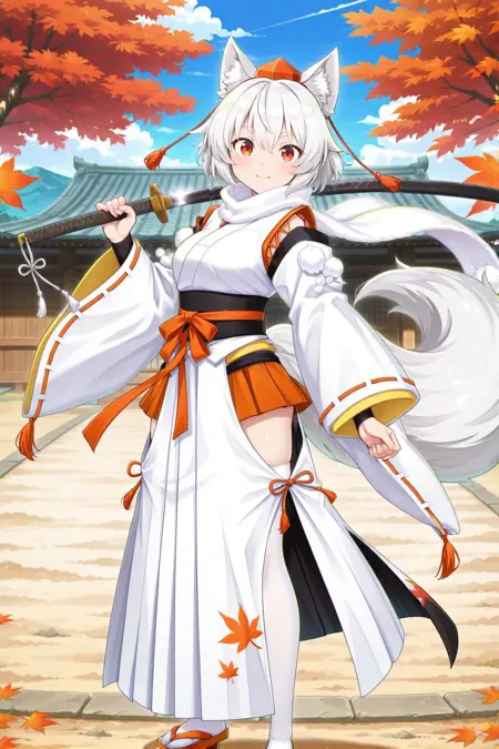 inubashiri momiji, 1girl, solo, red eyes, white hair, short hair, wolf girl, wolf ears, wolf tail, inubashiri momiji \(white wolf of staunch offense and defense\), official alternate costume, kourindou tengu costume, orange hat, tokin hat, pom pom \(clothes\), white scarf, detached sleeves, ribbon-trimmed sleeves, wide sleeves, kikkoumon, black obi, orange waist ribbon, clothing cutout, white thighhighs, tengu-geta, orange sandals, multiple swords, sheath,