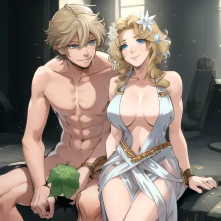 AdamAphrodite, a man and a woman, blonde-haired, hetero, cowboy shot, completely nude, sex