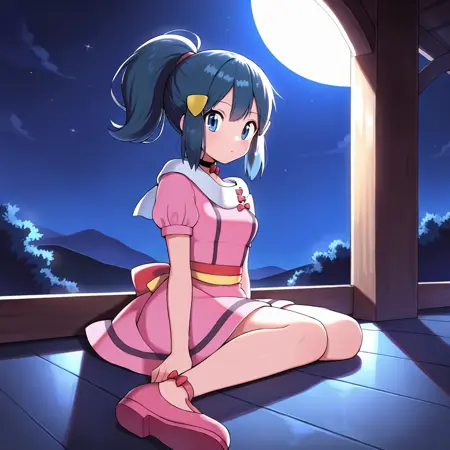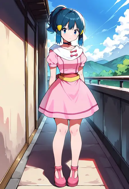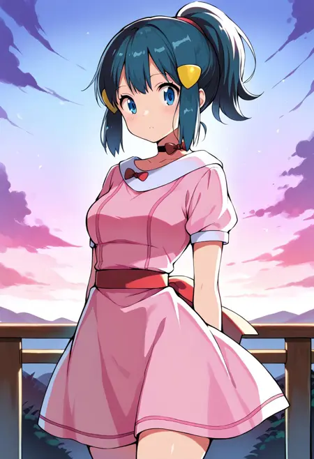 wdawn, [dawn \(pokemon\)], blue eyes, dark blue hair, short hair, sidelocks, ponytail, pink dress, short sleeves, choker, sash, knees, shoes, pink footwear